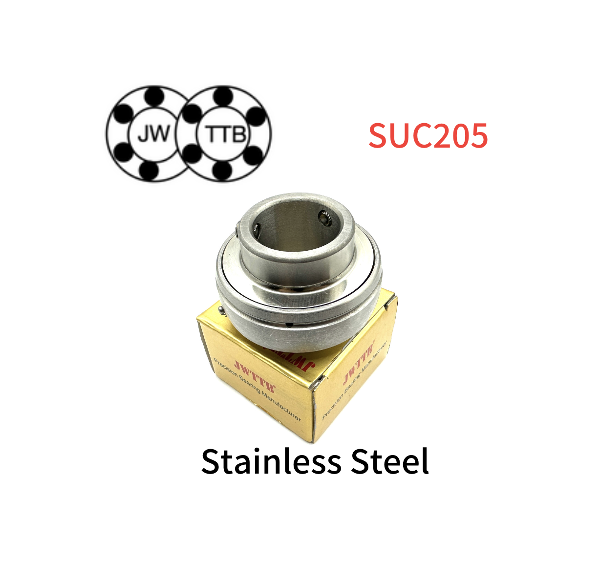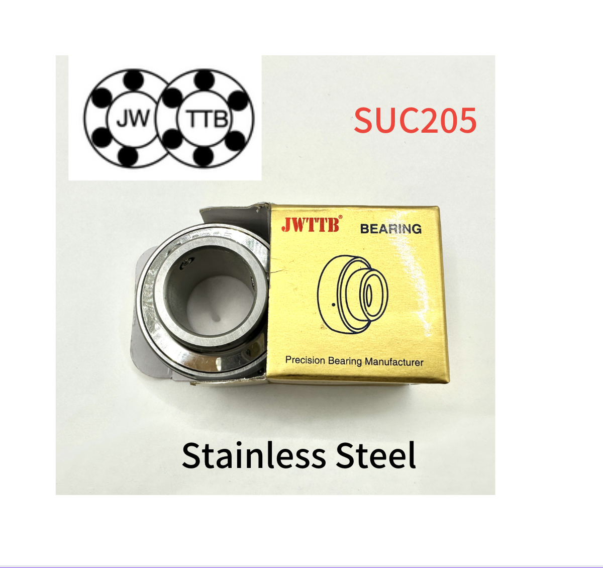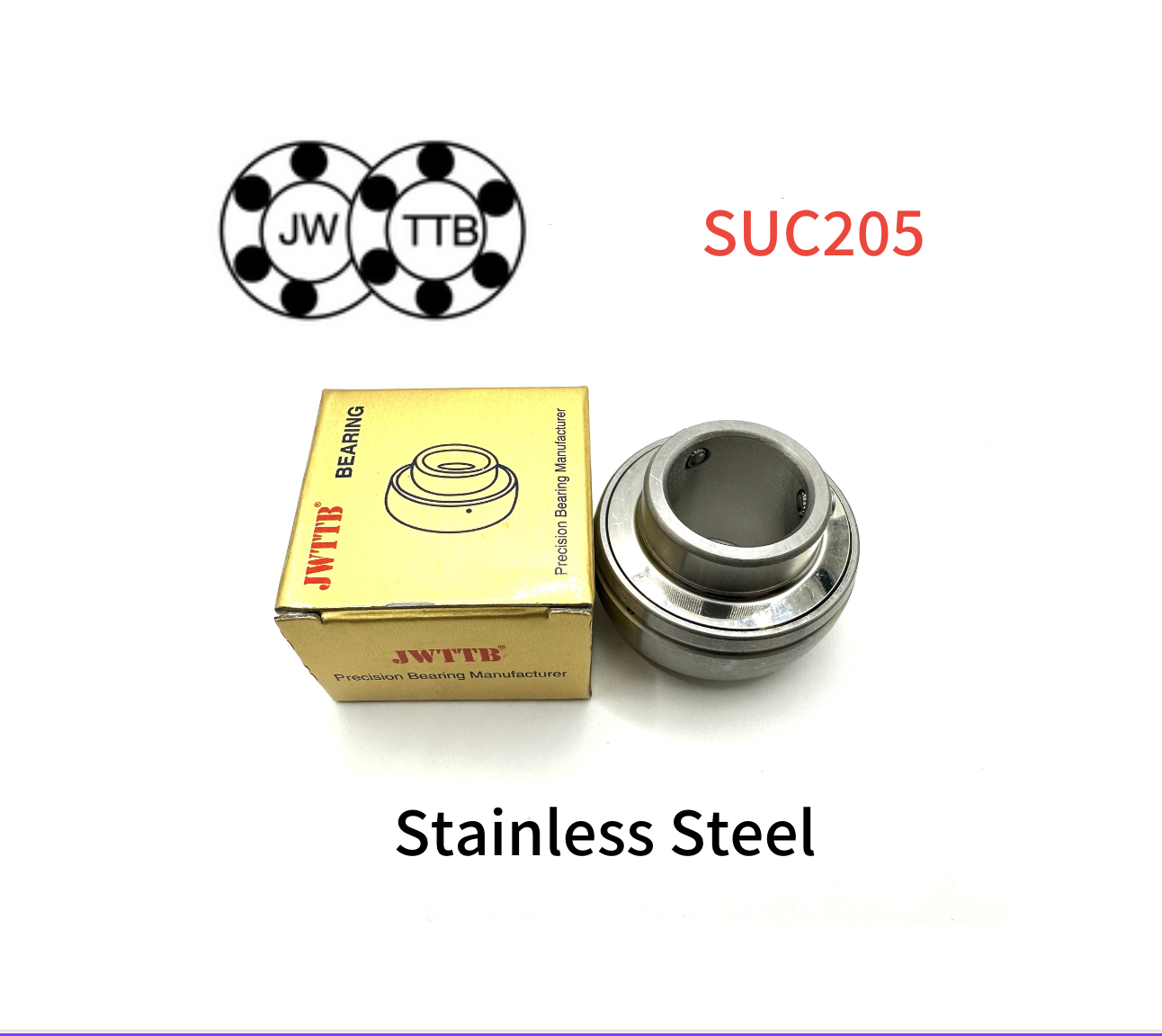 SUC205 is a "stainless steel outer spherical bearing" with both the bearing housing and inner ring made of AISI 304/440C stainless steel, featuring set screws and double-sided silicone seals. It is specifically designed for use in "humid, corrosive, and washable" environments, serving as a direct replacement for the ordinary bearing steel UC205.